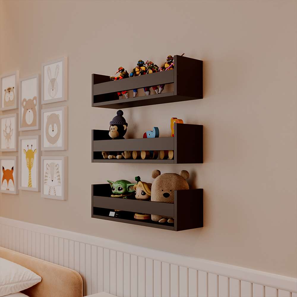 Kit 3 Prateleiras Porta Brinquedos Preta 50 x 12cm Suporte Invisivel é perfeita para tornar o seu ambiente mais criativo e moderno.