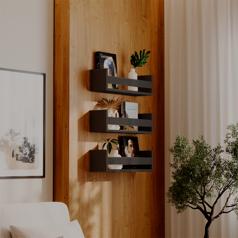 A Kit 3 Prateleiras Porta Livros Preta 60 x 12cm Suporte Invisivel é perfeita para tornar o seu ambiente mais criativo e moderno.
