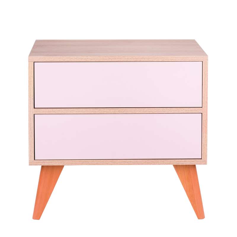Mesa de Cabeceira Retrô Modelo Bréscia na cor Carvalho Treviso (Madeira Clara) e portas Rosa Claro traz organização com estilo para o seu quarto. Possui lindos pés torneados em diagonal.