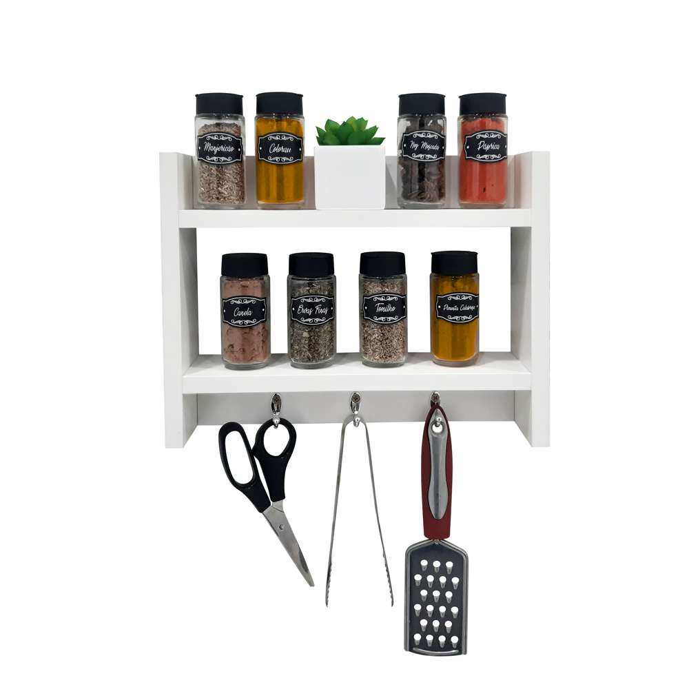 Ideal para guardar potinhos de temperos e demais condimentos da cozinha, possui ganchos para panos e objetos decorativos, tornando-o um produto versátil e prático para o uso no dia a dia.