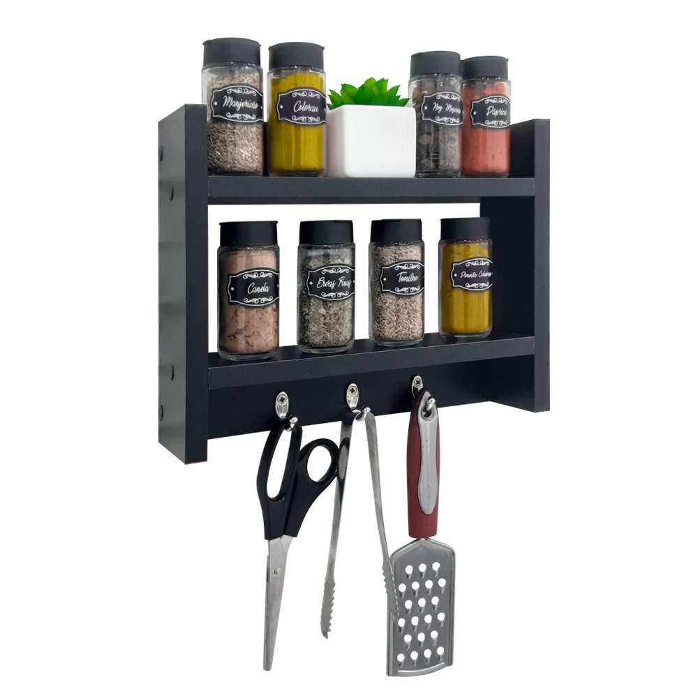 Ideal para guardar potinhos de temperos e demais condimentos da cozinha, possui ganchos para panos e objetos decorativos, tornando-o um produto versátil e prático para o uso no dia a dia.