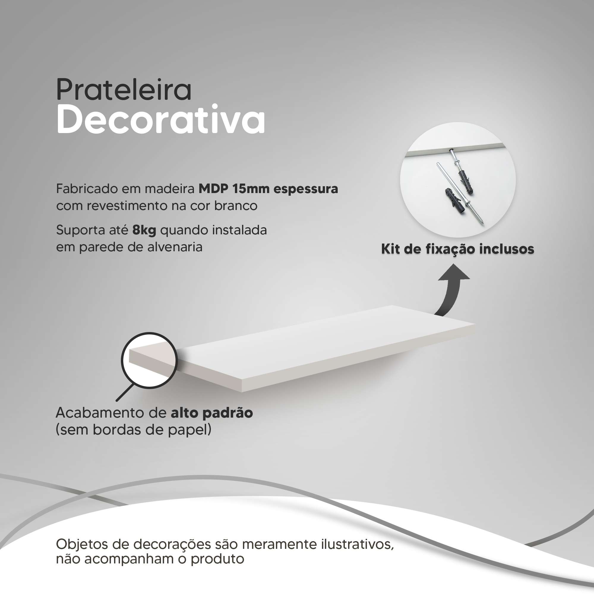 * Kit de fixação incluso (2 suportes de embutir invisíveis e buchas)